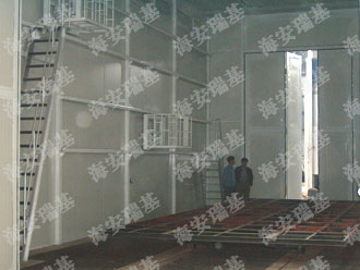 干式噴漆房的室體以鋼結(jié)構(gòu)支架壁板和玻璃墻板于一體,室體前端設(shè)有工件進(jìn)出通道,側(cè)面設(shè)有大型采光玻璃窗,室內(nèi)寬敞明亮。室體的上部設(shè)有被動進(jìn)風(fēng)過濾層,使空氣按層流狀態(tài)均勻的進(jìn)入噴漆室內(nèi)。室體頂部的終效過濾層由一塊塊過濾板組合而成,在噴漆室頂部可以很方便地拆裝和清理。