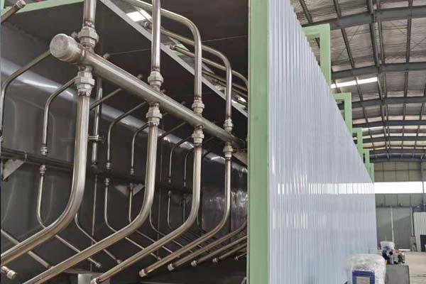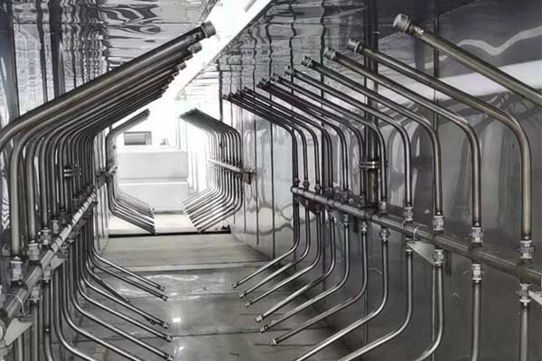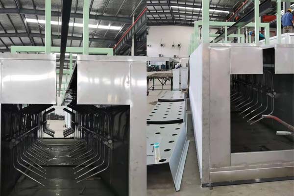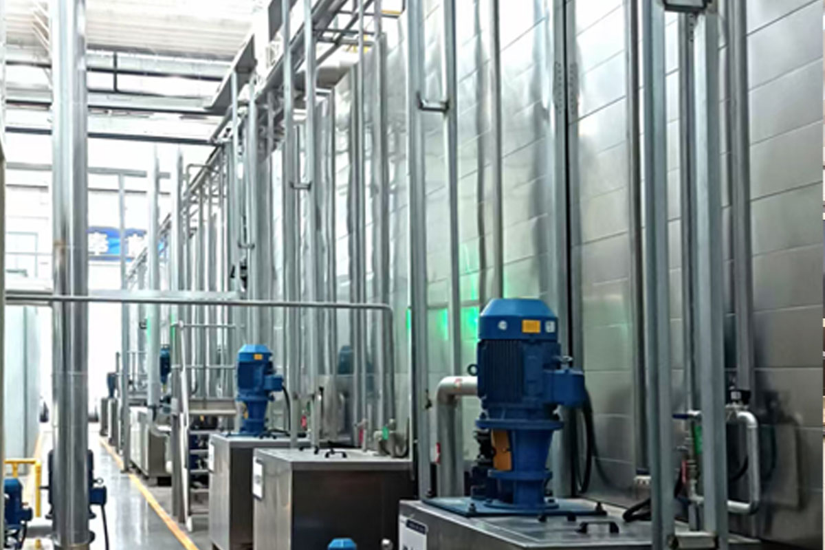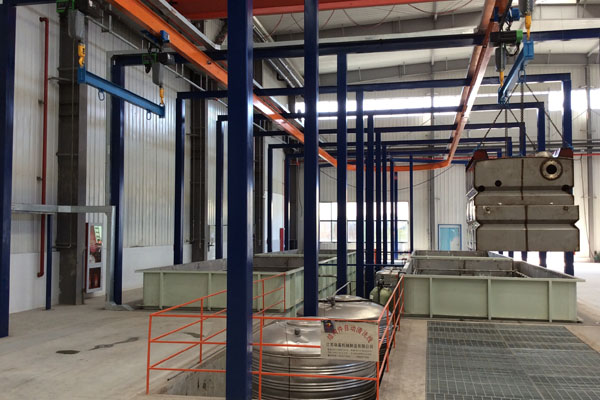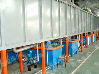 前處理生產(chǎn)線結(jié)構(gòu)特點是:前處理生產(chǎn)線各工序噴淋管布置在隧道內(nèi),噴淋由各液槽的泵來提供.各工序間都有門洞板隔開,以防竄液.各加熱液槽的加熱形式有槽內(nèi)和槽外。內(nèi)加熱器有排管、蛇形管、波紋板等;外加熱器有列管、板式加熱器等。加熱介質(zhì)有熱水 、蒸汽、導熱油等。在脫脂、磷化工序分別設(shè)有除油系統(tǒng)和除渣系統(tǒng)。為防止各加熱段隧道頂部及門洞處溢出蒸汽,在隧道頂部設(shè)有排風機。